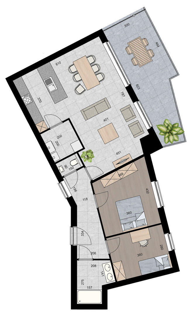 Inkomhal, toilet, woonkamer, keuken, 2 slaapkamers, wasplaats, badkamer, terras