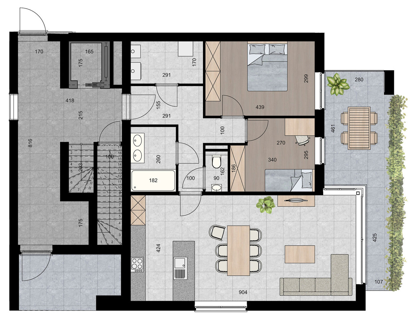 Inkomhal, toilet, woonkamer, keuken, 2 slaapkamers, wasplaats, badkamer, terras