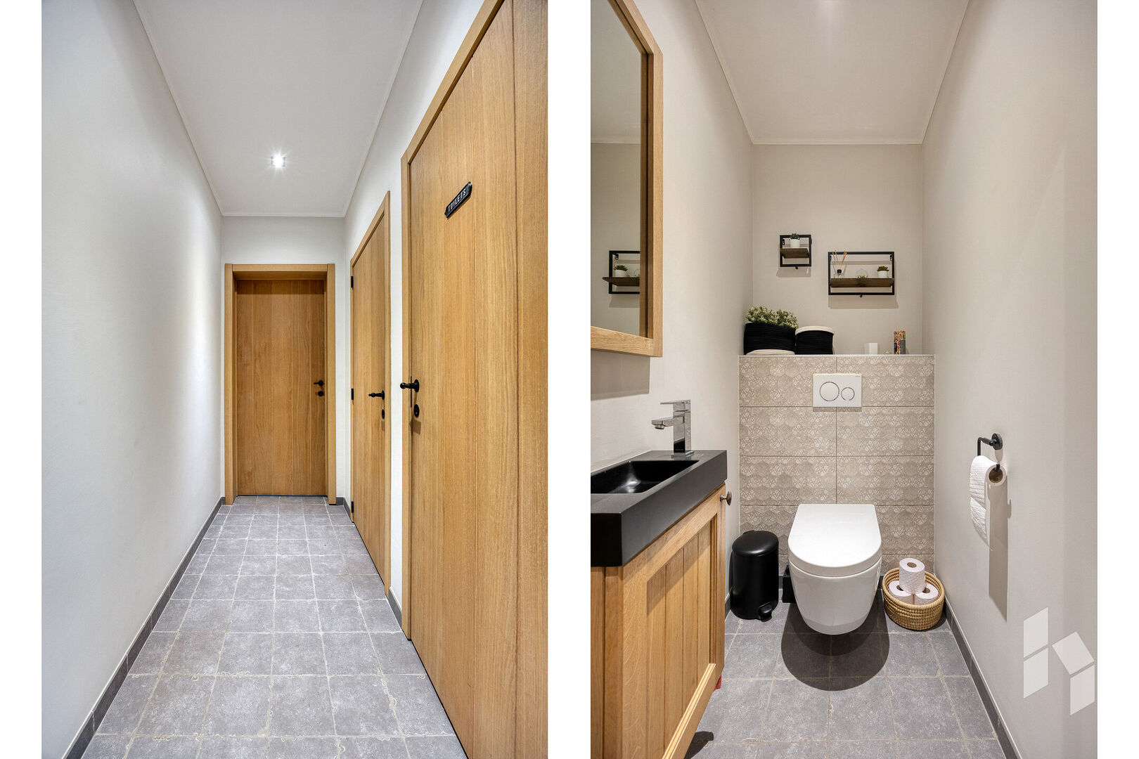 Gelijkvloers: inkomhal, toilet, woonkamer, bureauruimte, eetkamer, keuken, wasplaats, slaapkamer, badkamer, berging