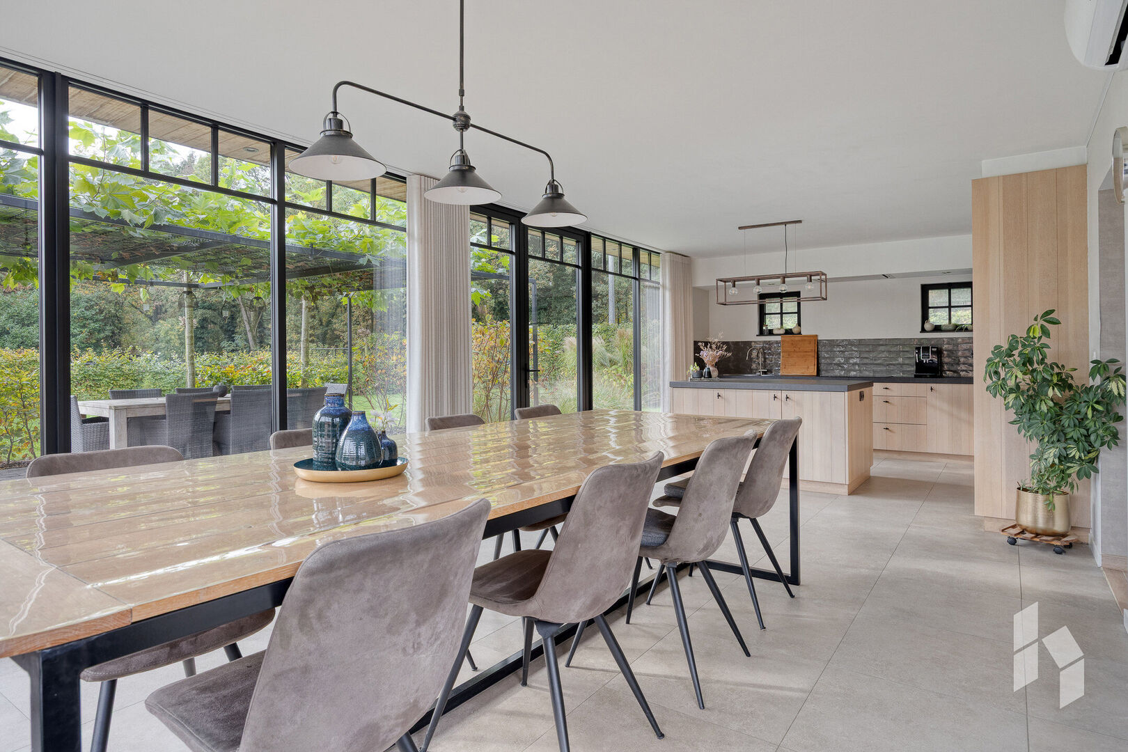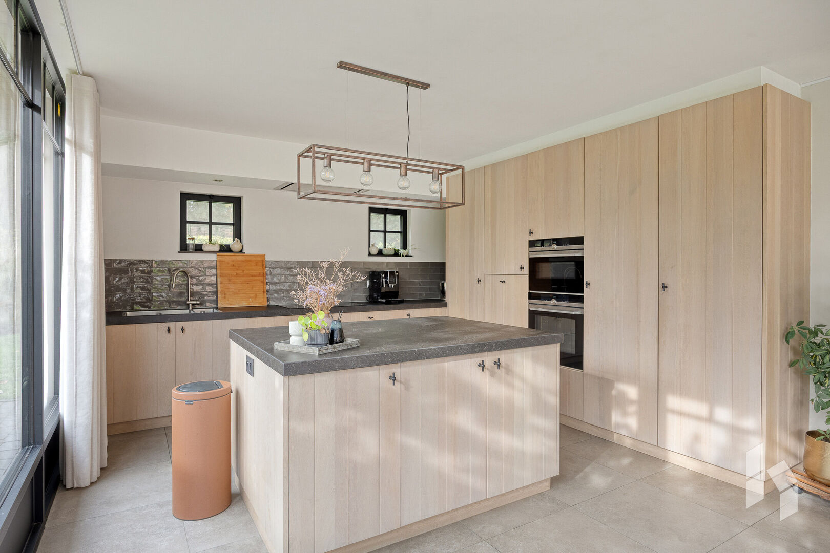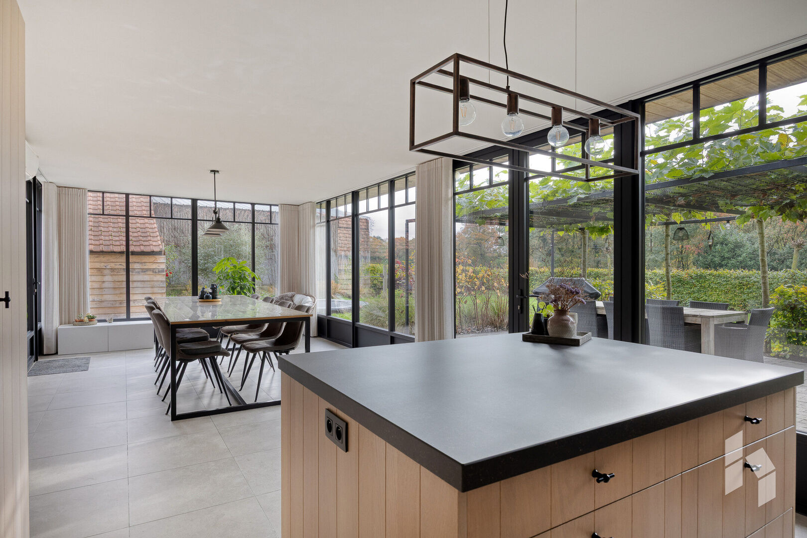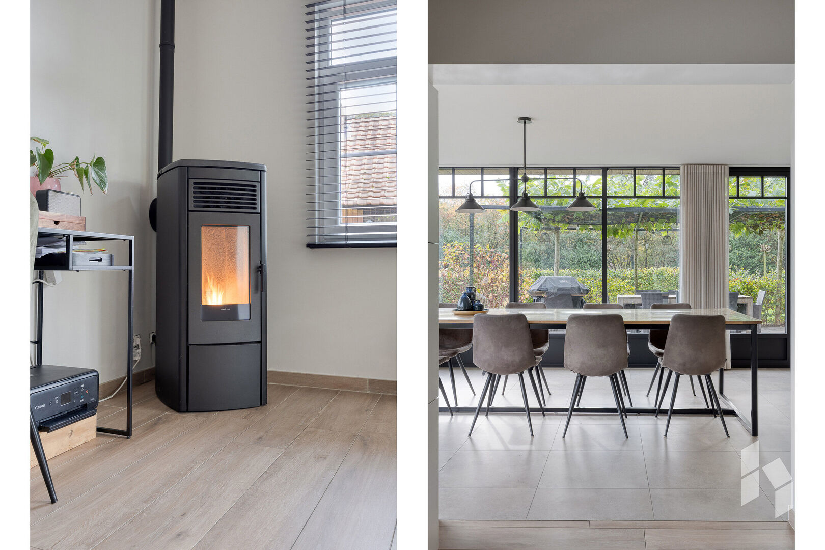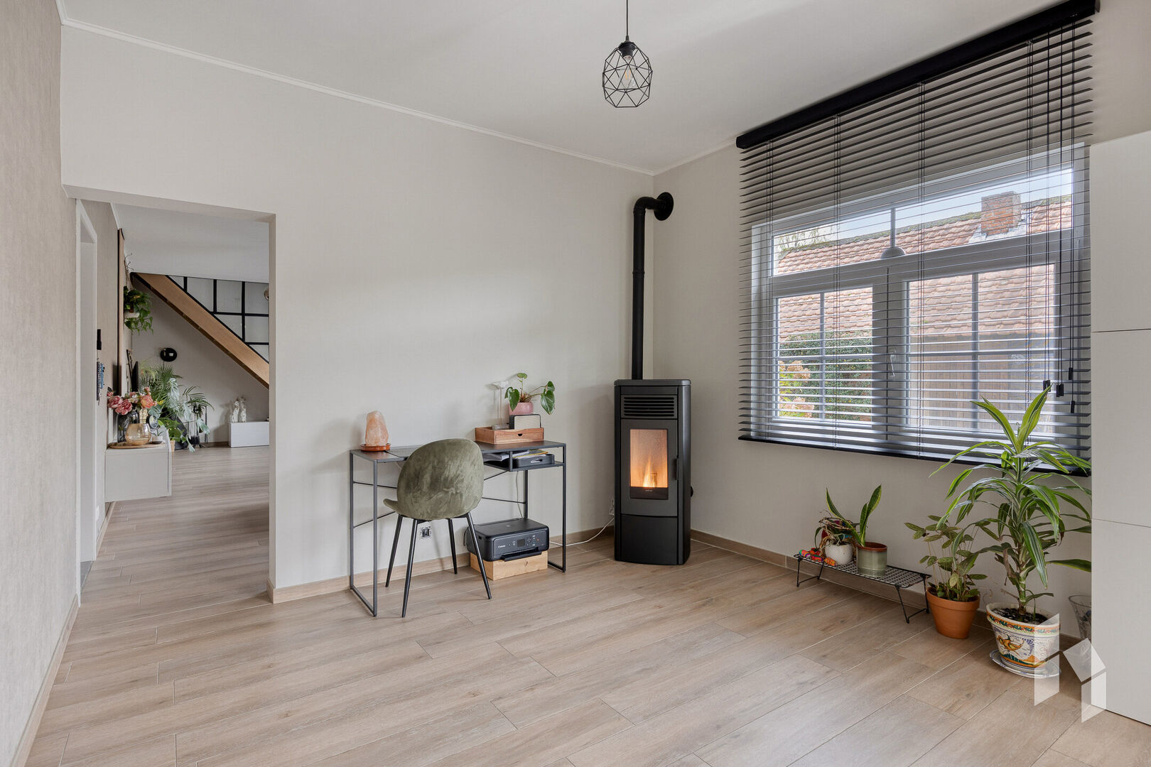 Gelijkvloers is er een gezellig ingerichte woonkamer aanwezig dewelke grenst aan een mooie lichtrijke leefruimte, deze is opgedeeld in een bureaugedeelte, een ruime eetkamer en een prachtige, open keuken met zicht op de tuin.