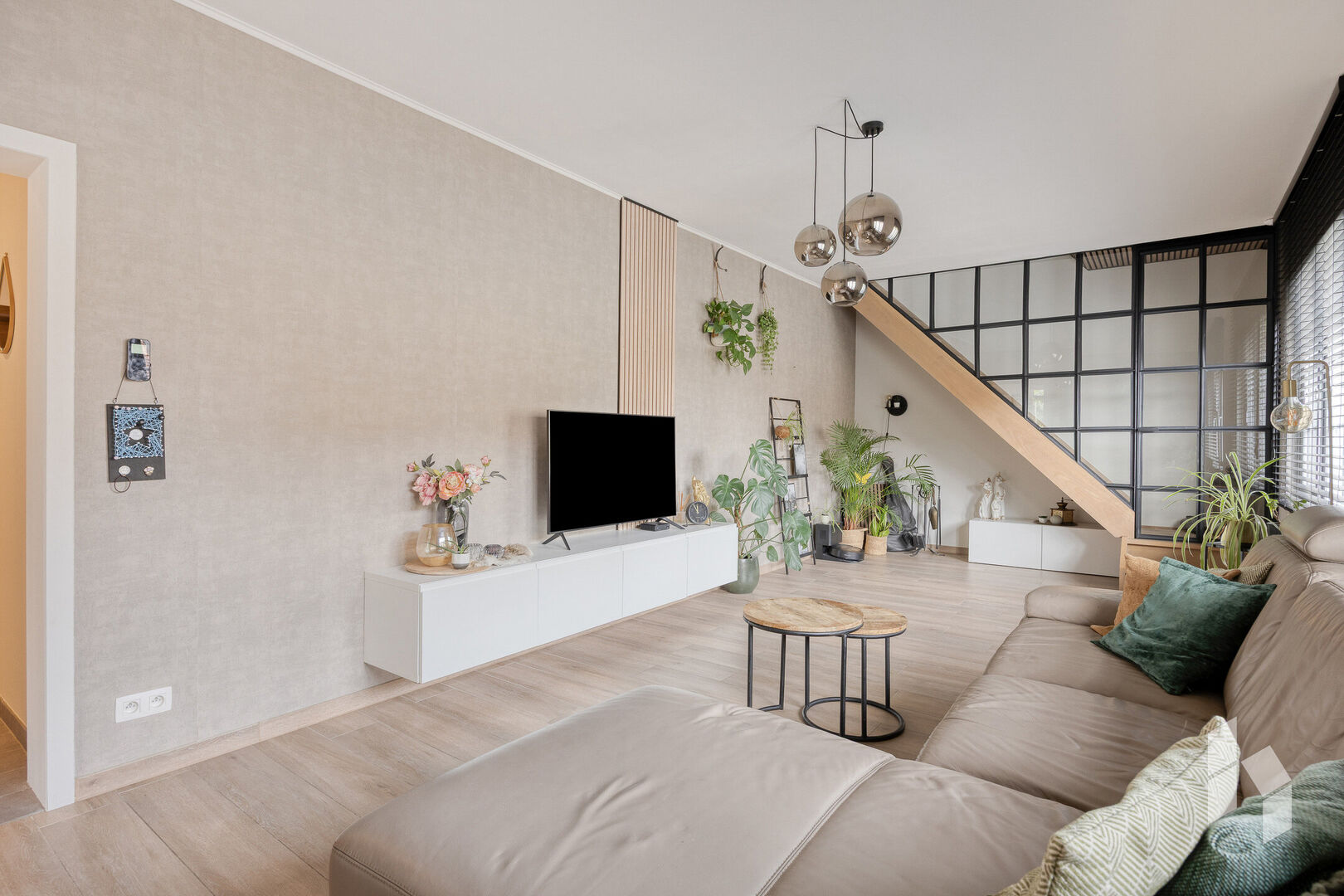 Een mooie glazen wand scheidt de woonkamer met de trap, deze loopt dan over in een nachthal met ingemaakte kasten.