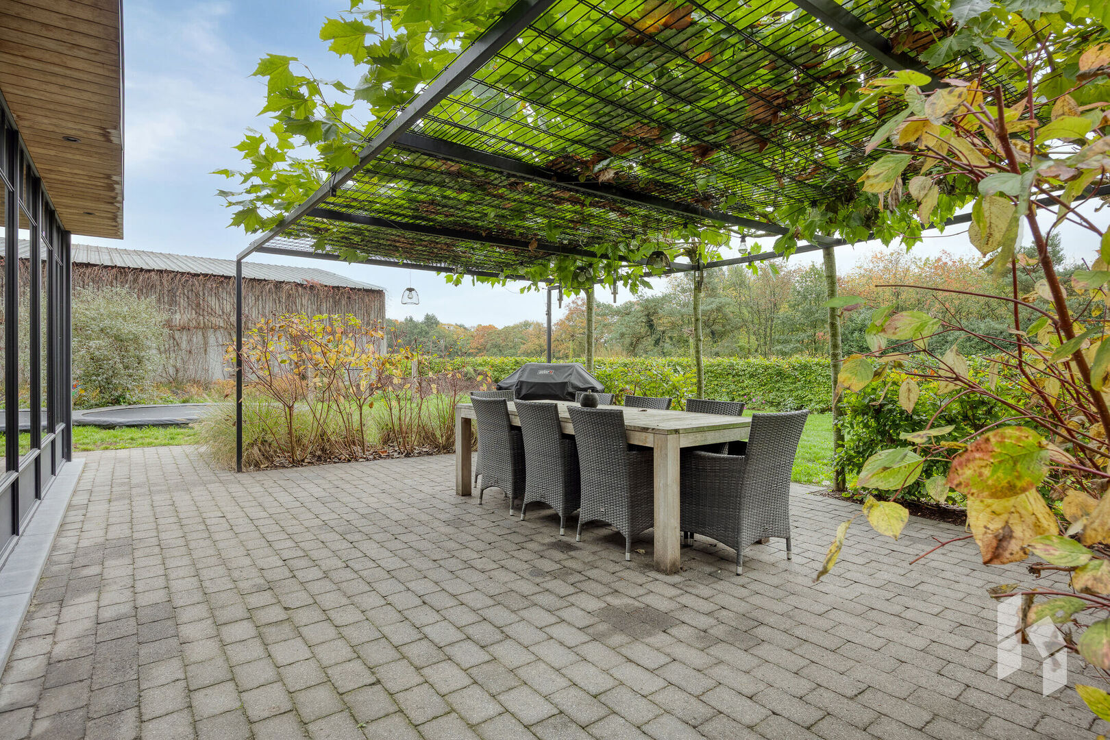 Buiten is het fijn vertoeven op het terras en deze beschikt over een mooi begroeide pergola en grenst aan de zuidoostelijke georiënteerde tuin met vrij zicht over de weilanden.