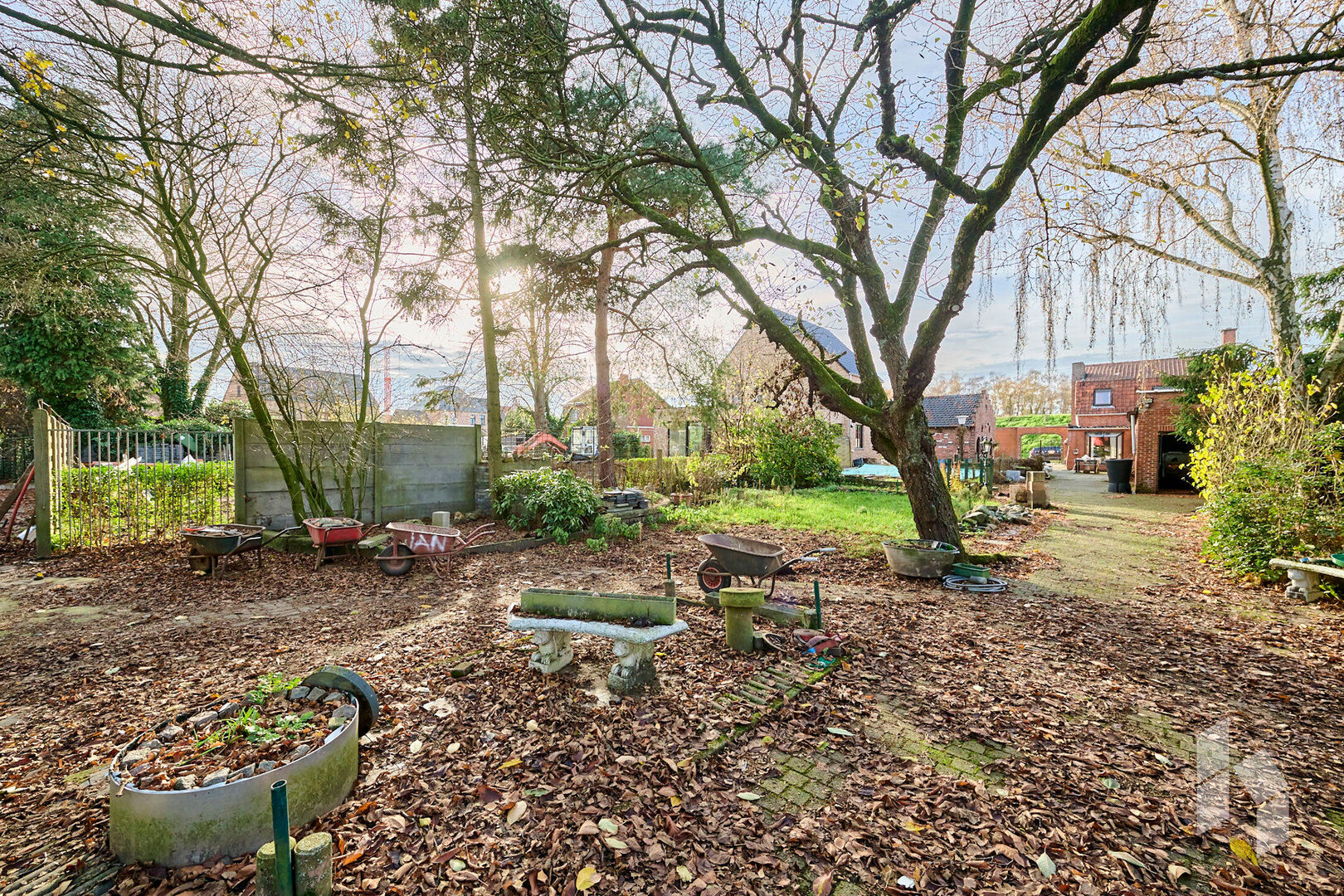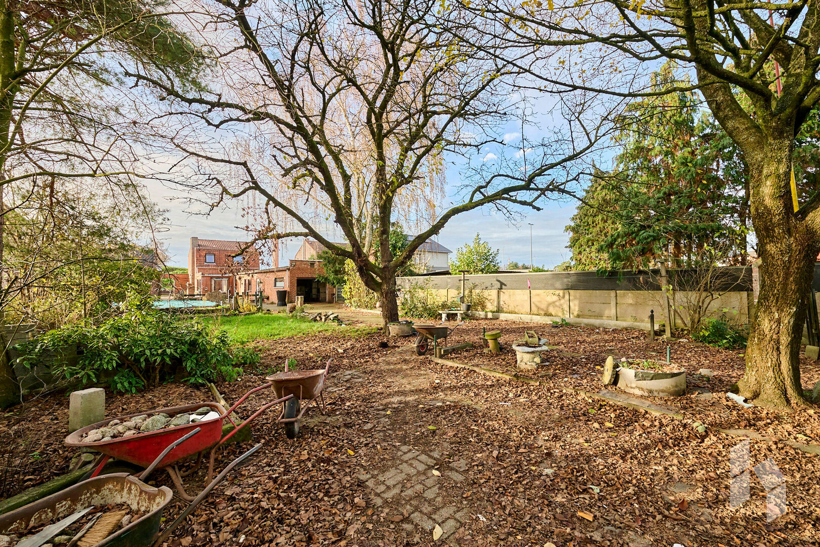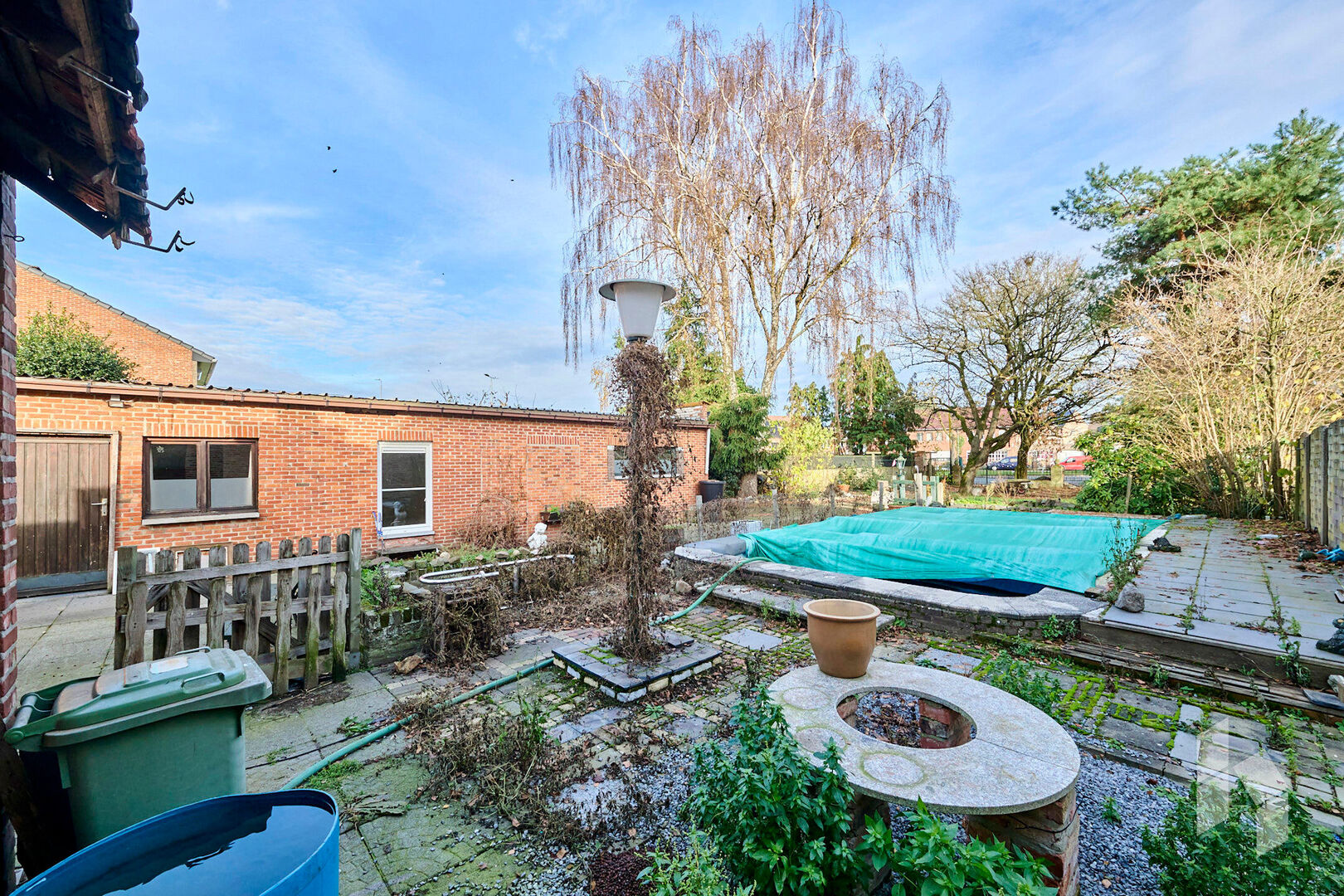 De zonnige tuin is volledig omheind en heeft nog een voormalig zwembad.