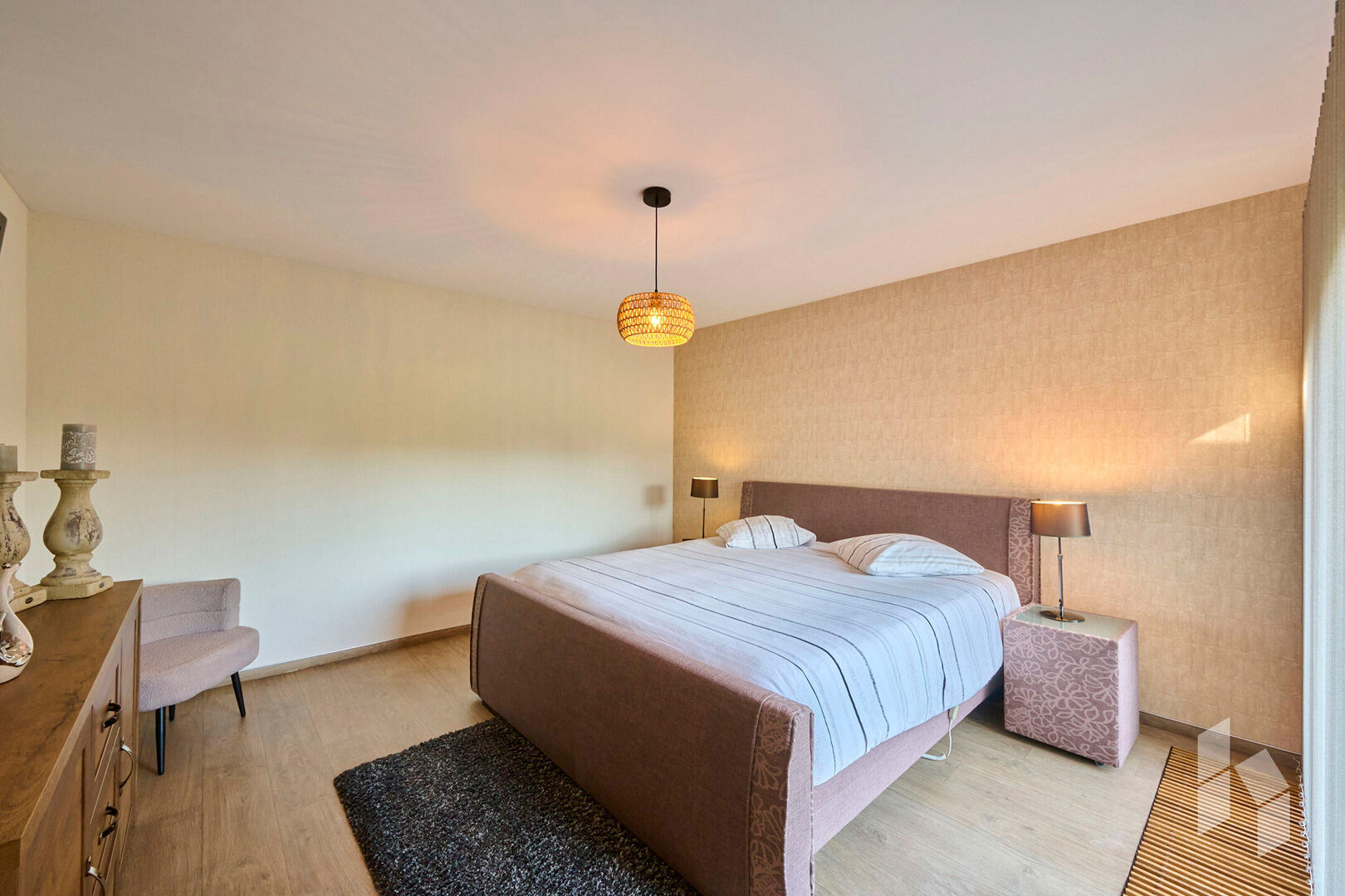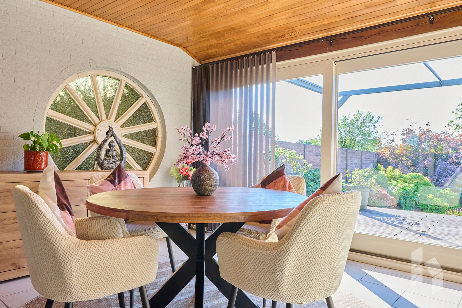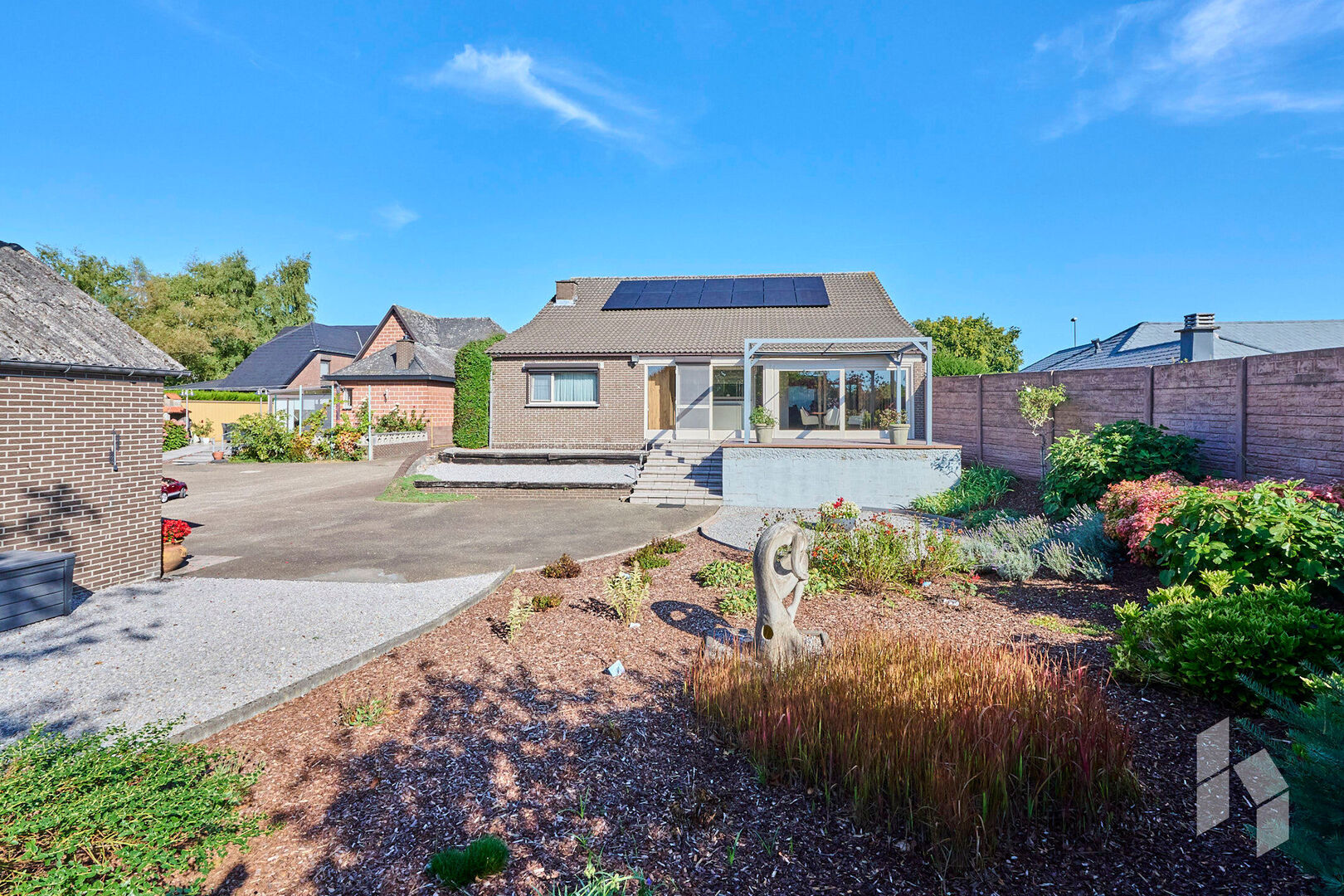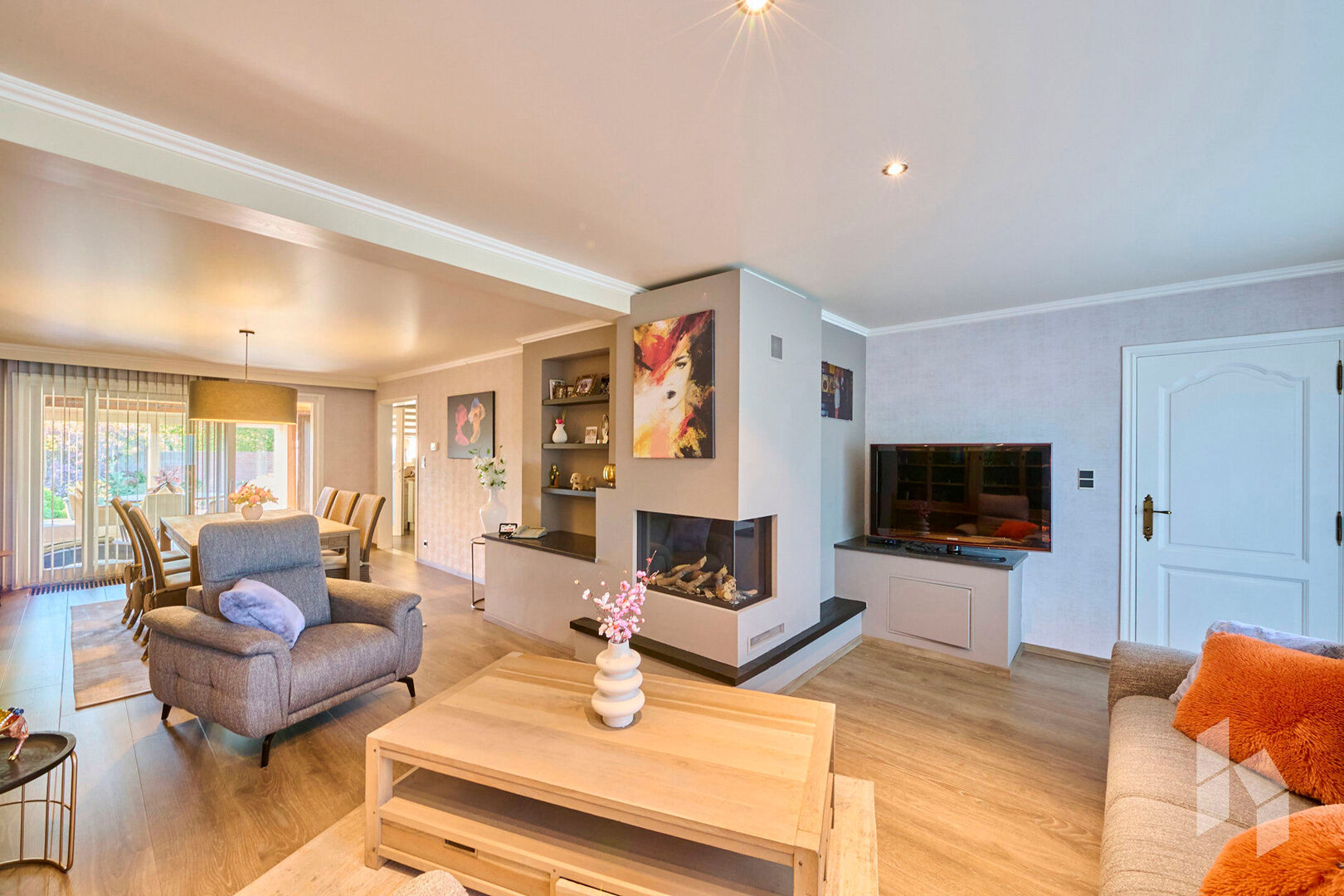 Zeer goed onderhouden, instapklare gelijkvloerse woning (189 m²) met een gezellige woonkamer met gashaard, een veranda uitkijkend op de tuin, 2 (mog.3) slaapkamers en een garage op een mooi perceel van 1778 m² nabij het centrum van Lommel.