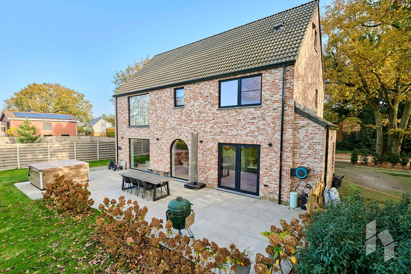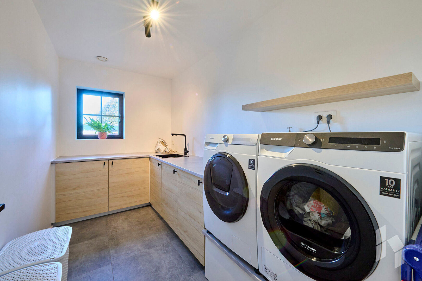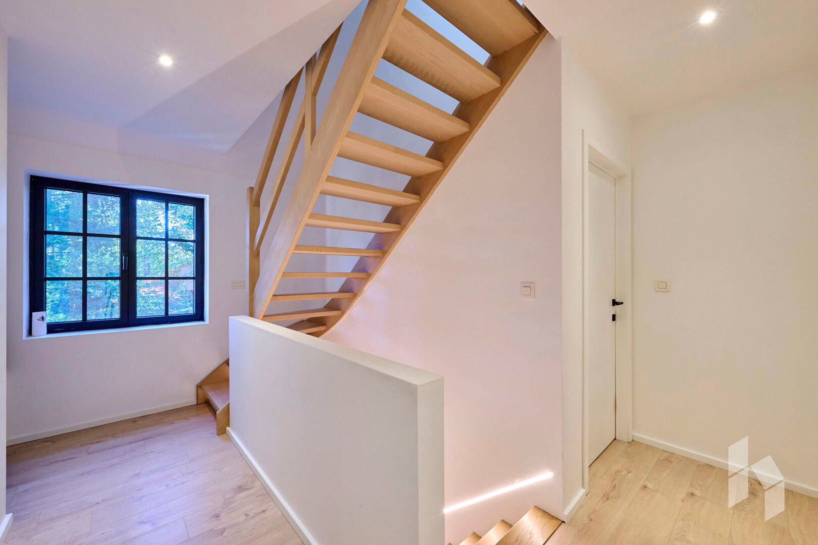 Via de inkomhal kom je terecht in de open, lichtrijke leefruimte, vanwaar je overal een zicht hebt op de ruime tuin achteraan. Er is in de woonkamer een gezellige houthaard voorzien en ook een apart gedeelte om eventueel in te richten als bureau. In het midden van de ruimte is er de eetkamer die uitgeeft op de prachtige, landelijke keuken - de eyecatcher van deze woning! Gelijkvloers is er dan nog een apart toilet en een berging.