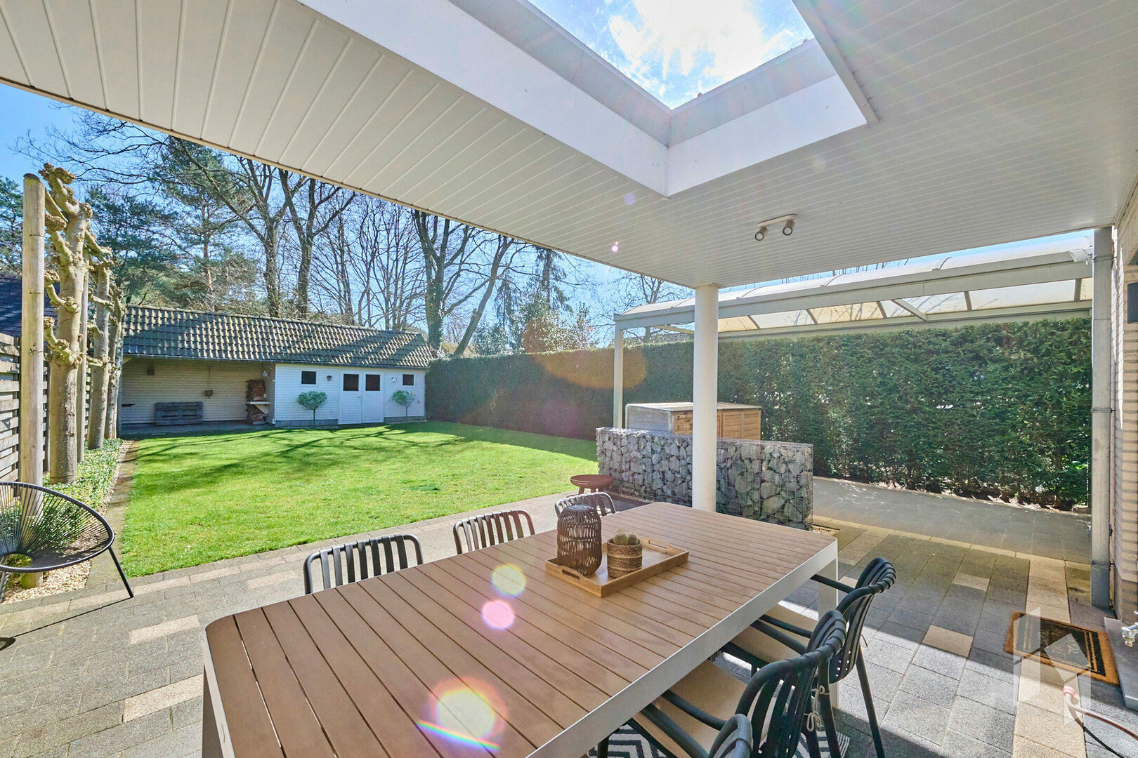Buiten is er een afgesloten en aangelegde tuin aanwezig, deze beschikt over 2 overdekte terrassen en een tuinhuis, het volledige perceel heeft een oppervlakte van 400 m².