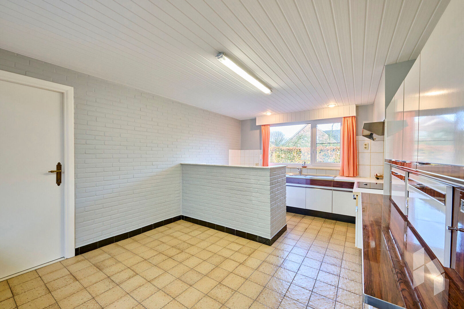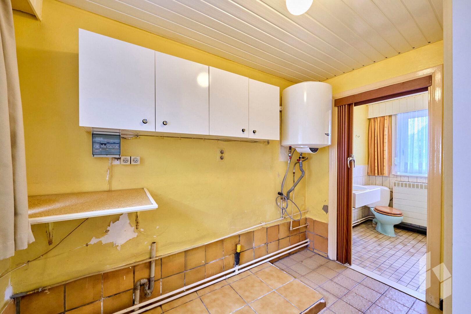Gelijkvloers: Veranda, douchekamer, wasplaats, badkamer, keuken, living, cv ruimte, 1 slaapkamer