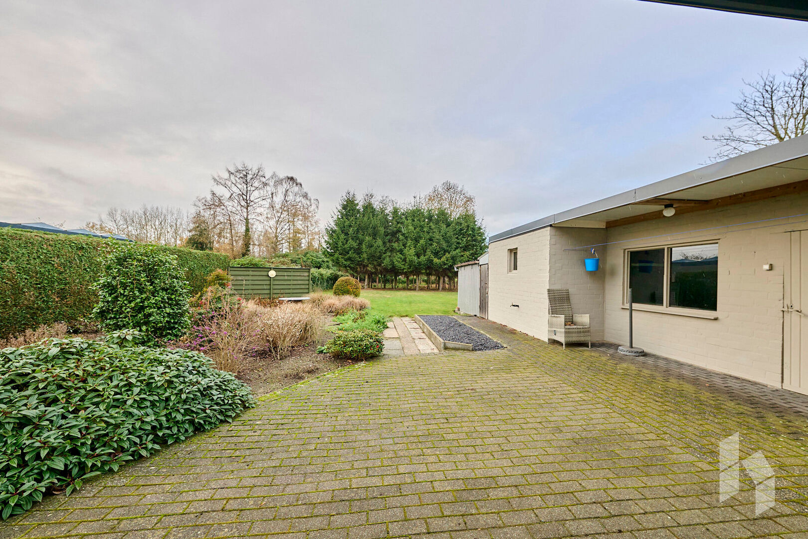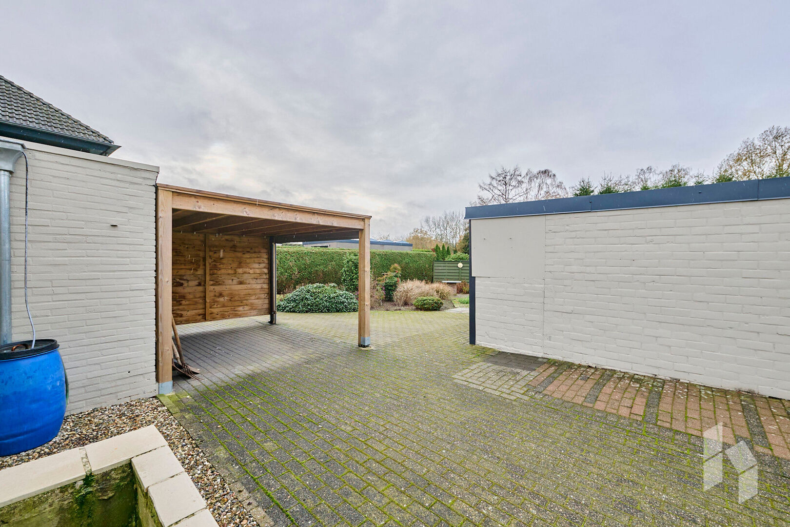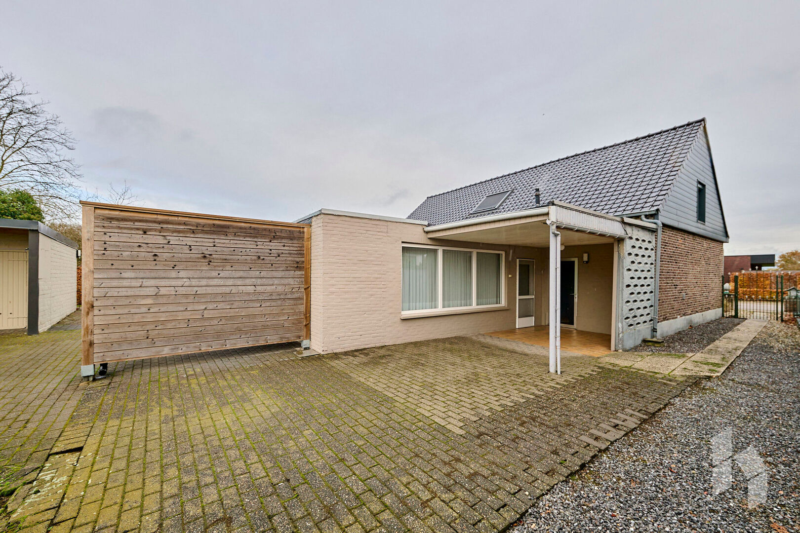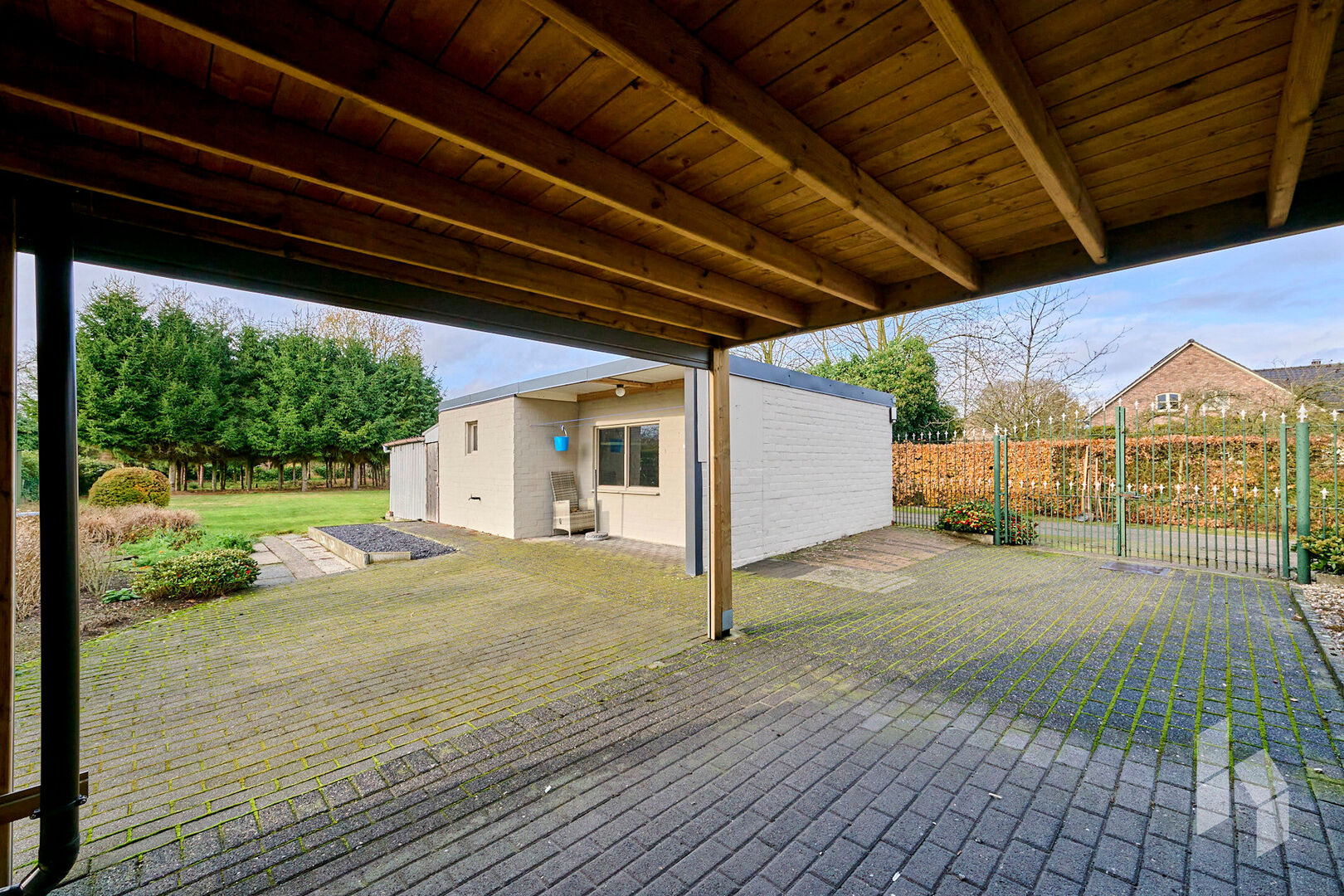 De servitudeweg geeft naast geen directe buren ook het voordeel dat je via hier de garage en de poort vanuit de zijkant kunt inrijden.