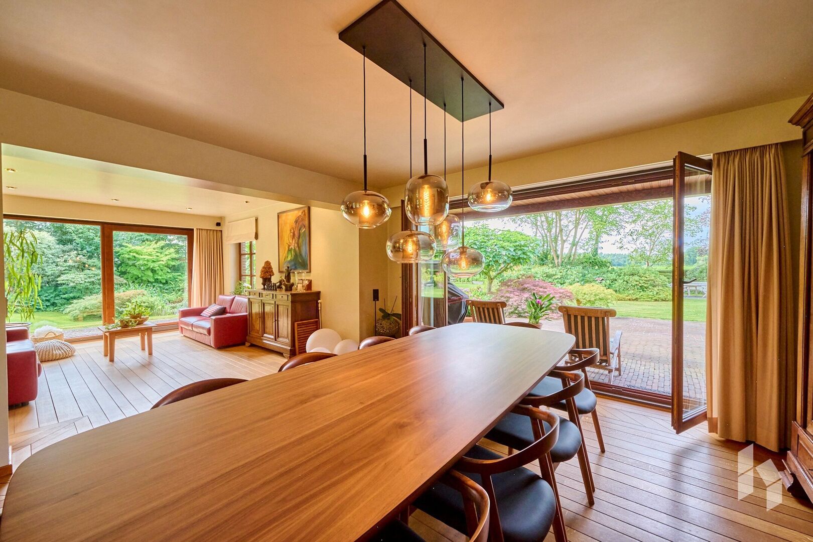 De ruime woonkamer is ingedeeld in twee zitgedeeltes en een eetkamer, met overal veel lichtinval. Via een grote raampartij is er toegang tot het overdekt terras.