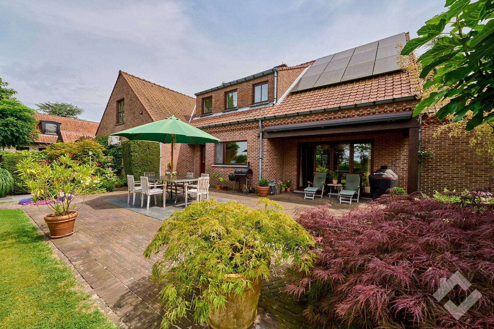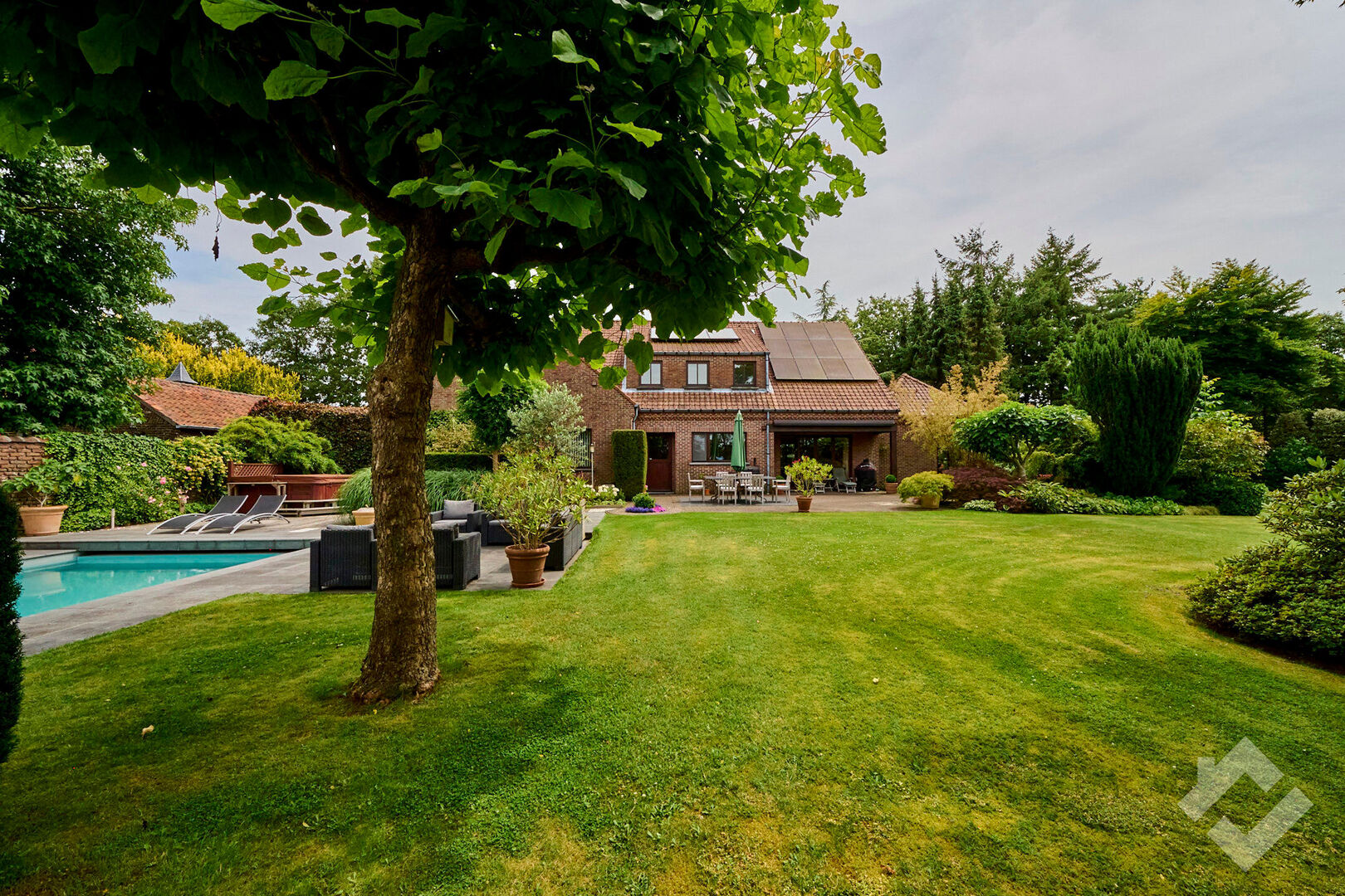 Buiten is het heerlijk vertoeven in de prachtig aangelegde tuin uitgerust met 4 terrassen, elk met een eigen uitzicht op de tuin die de mogelijkheid geven om zowel overdekt te zitten, als ingesloten of onder de bomen. Als troef is er dan ook nog een mooi zwembad dat zorgt voor de nodige verfrissing en ontspanningsmomenten.