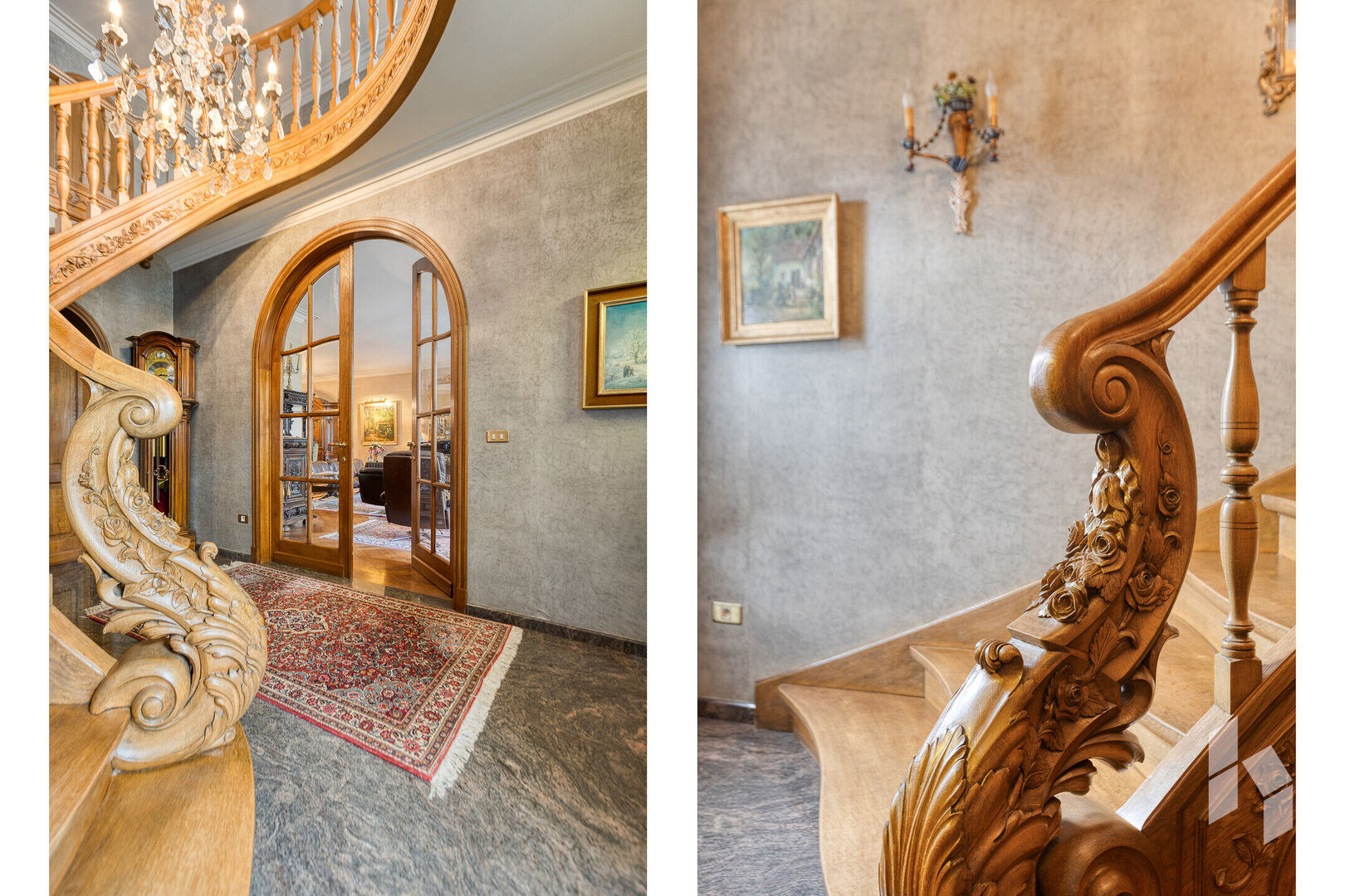 Gelijkvloers kom je binnen via een indrukwekkende inkomhal die toegang geeft tot de gezellige woonkamer en verder doorloopt naar de keuken.