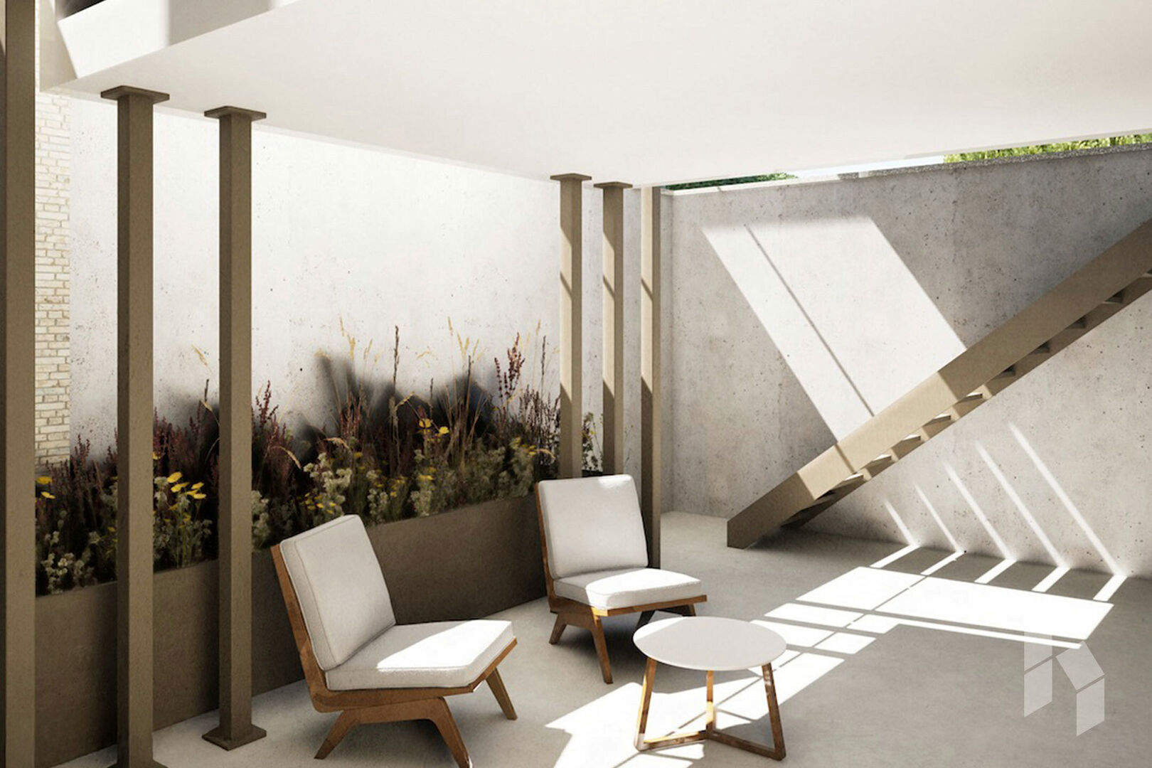De glaspartijen achteraan zorgen voor een mooie connectie met de tuin, deze zal voorzien worden van gras en hoogstammige bomen achteraan.